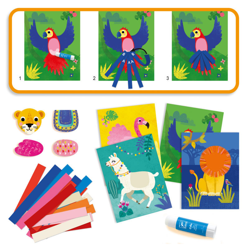 Contenu: 4 tableaux pré-illustrés à compléter, environ 80 bandelettes de papier à coller, 1 tube de colle, 4 éléments de finition à coller et 1 notice explicative en couleur