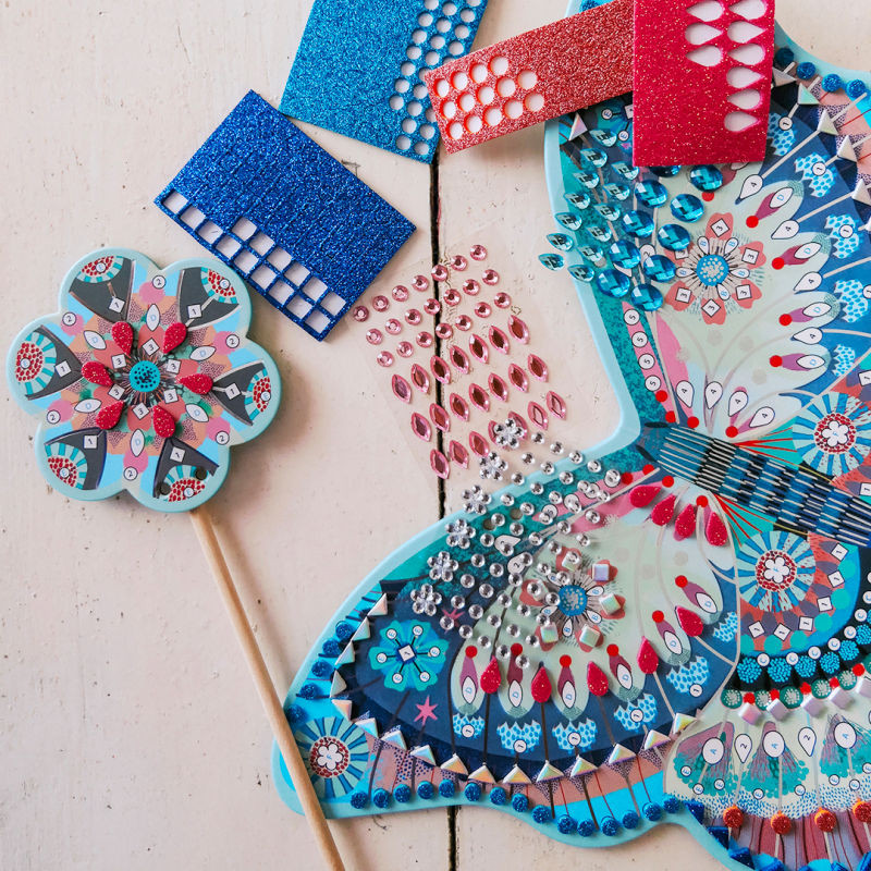 Contenu: 1 paire d'ailes illustrées en carton résistant, 2 lanières élastiques, 1 baguette magique, 5 planches de stickers mosaïques pailletés en mousse, 3 planches de stickers "pierres précieuses" et 1 notice explicative pas à pas en couleur