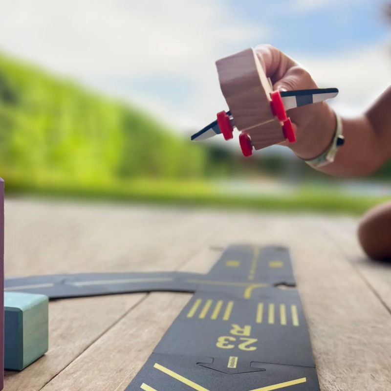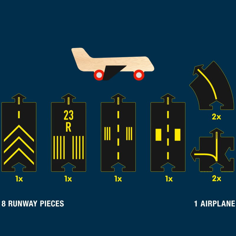 Ce coffret de 8 pièces en caoutchouc + 1 avion en bois vous permettra d'assembler la piste d'un aéroport qui servira de support à de nombreux jeux pour les enfants.