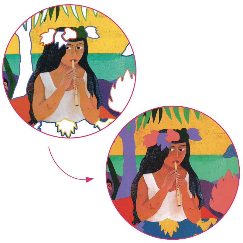 Vanessa Hié s'inspire du travail de Paul Gauguin et propose de compléter à la gouache et au pinceau 4 tableaux exotiques aux couleurs chatoyantes.