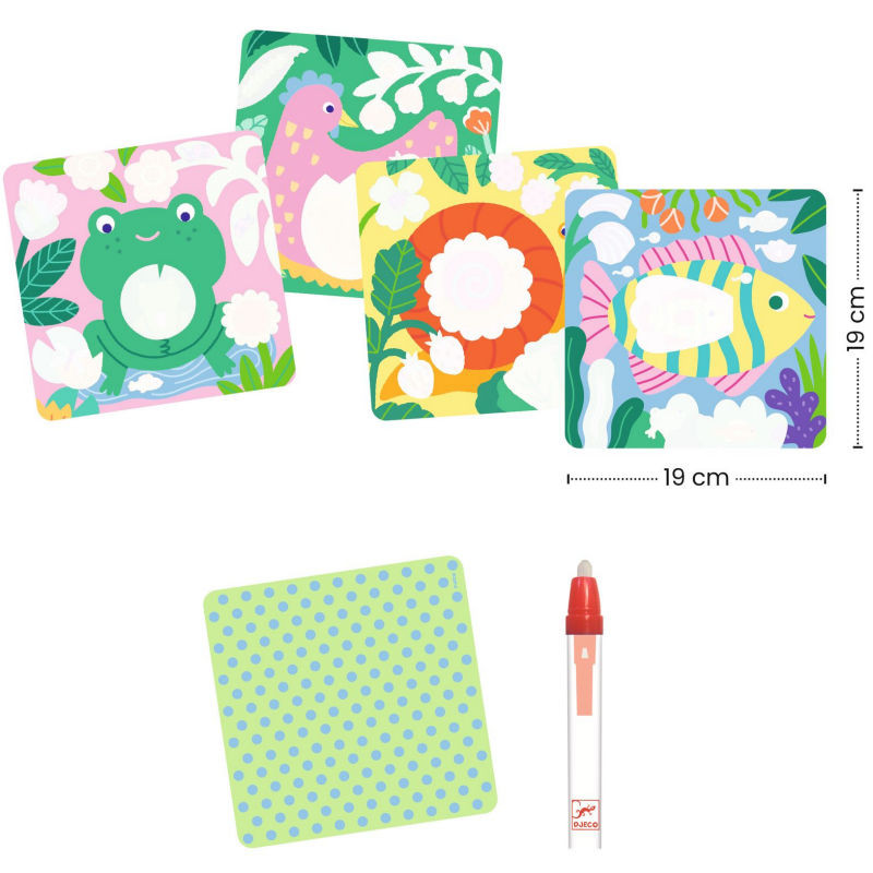 Contenu: 1 crayon à réservoir (que l'on remplit avec de l'eau), 4 planches illustrées carrées (19 x 19 cm) en plastique souple (avec une couche blanche qui disparaît à l'eau) et 1 support rigide en carton épais