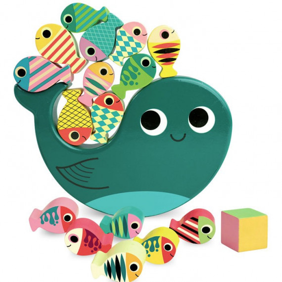 Contenu: 1 baleine et 16 poissons en bois massif, peints des deux côtés, 1 dé "couleurs" en bois