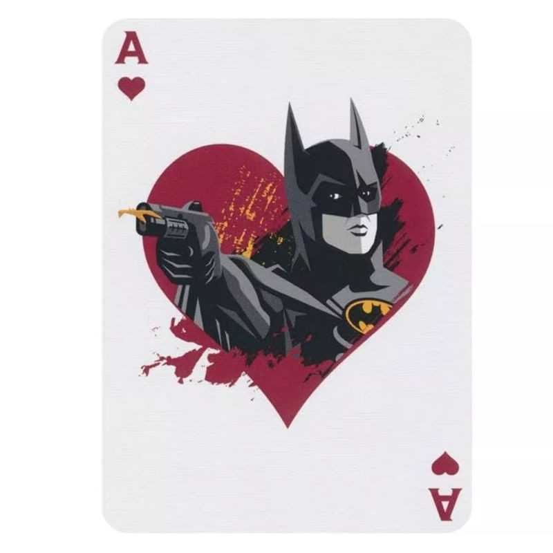 Un jeu de cartes aux familles traditionnelles: Coeur, Pique, Trèfle et Carreau, illustré avec les personnages des aventures de Batman, le super-héros de l'univers DC Comics créé en 1940.