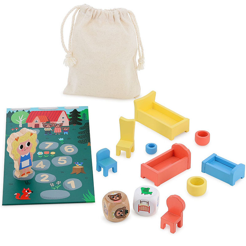 Contenu: 1 plateau de jeu en carton, 1 pion Boucle d'Or en bois, 2 dés en bois, 3 lits, 3 chaises et 3 bols en bois, 1 pochon en tissu et la règle du jeu (en 9 langues)