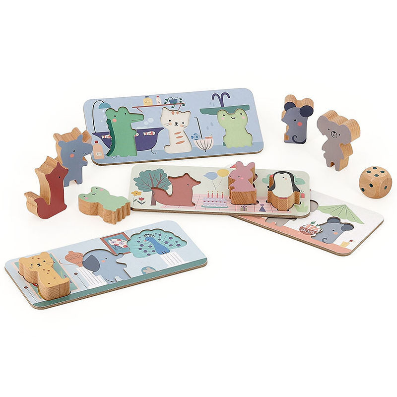 Contenu: 1 plateau de jeu réversible (30 x 30 cm), 4 planches de loto illustrées (avec encastrement des pièces), 2 cannes à pêche aimantées, 1 dé en bois, 12 animaux, 1 sac de rangement en toile et la règle des jeux