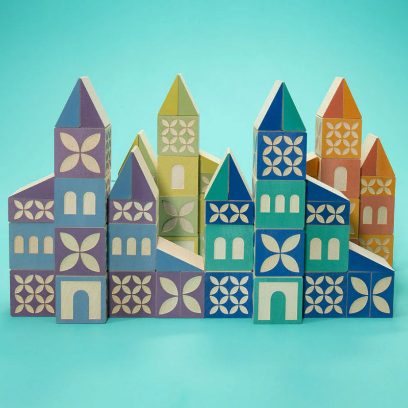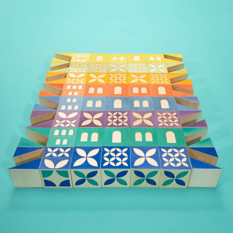 32 blocs, 32 triangles et 16 demi-blocs pour réaliser des bâtiments, des tours et des ponts aux couleurs vives et aux motifs modernes. Des gravures de portes, fenêtres, arches et des motifs décoratifs égayent les faces des cubes avec un rendu magnifique. Les triangles colorés peuvent former des toits, des bases de ponts, et bien plus encore...