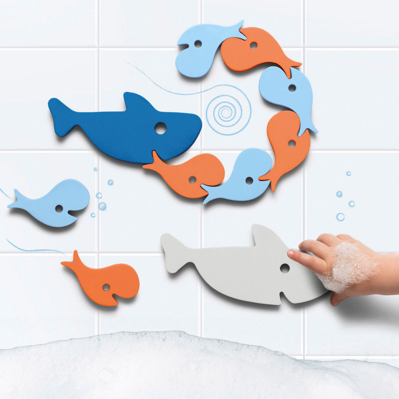Cet amusant puzzle de bain est composé de pièces en forme de poissons et de requins.