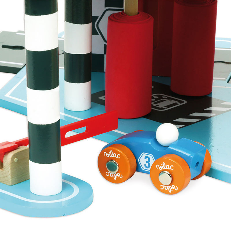 Un très beau garage en bois VILAC compatible avec la majorité des petites voitures en métal.