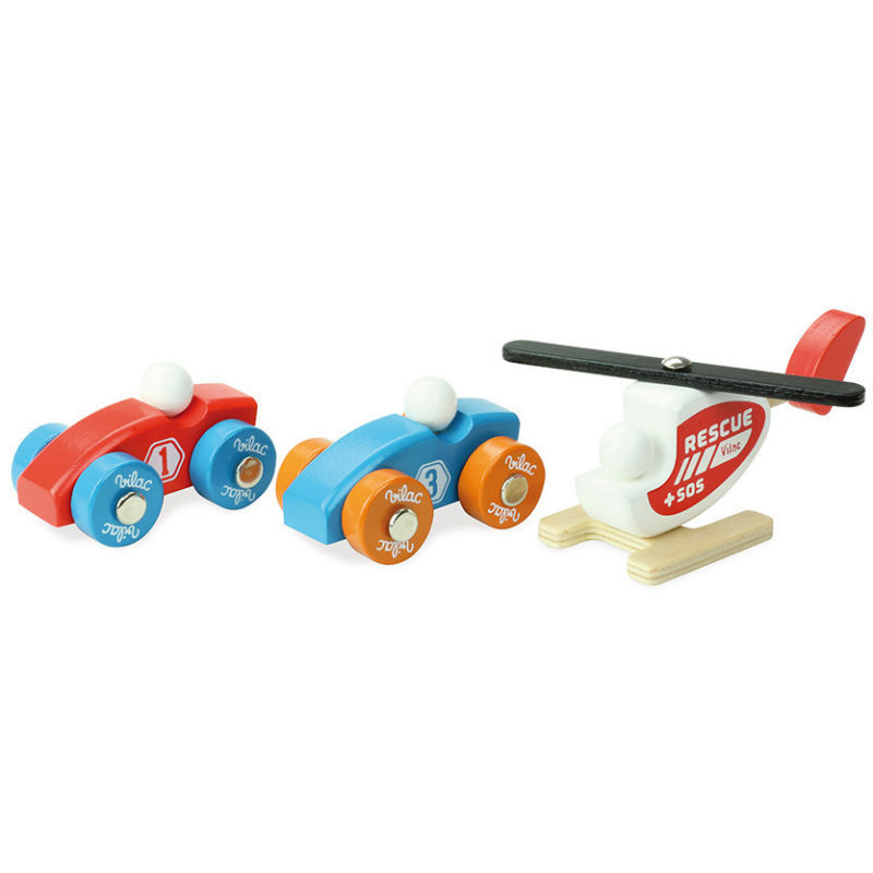 Il est livré avec 3 véhicules: 2 voitures et 1 hélicoptère en bois.