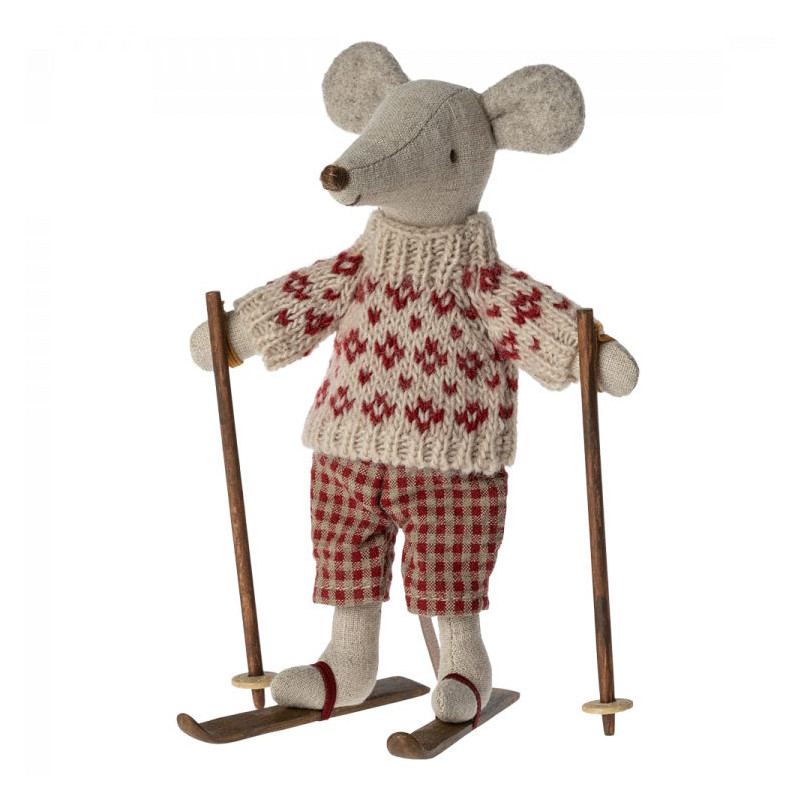 Durant l'hiver, Maman souris chausse ses jolis skis en bois pour dévaler les pistes enneigées ! Toujours élégante avec son pull tricoté en jacquard et son pantalon de ski à carreaux...
