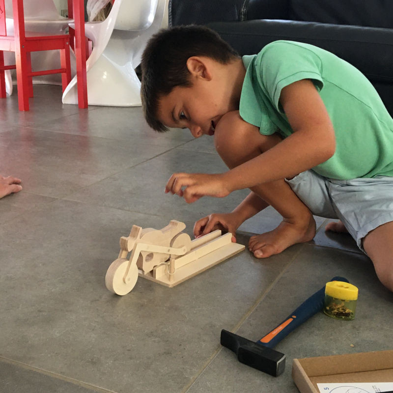 Manufacture en famille propose aux enfants dès 5 ans de construire une moto rétro en bois avec son lanceur. Sobre et élégante, elle les plongera dans l’univers des belles mécaniques ! Un kit fabriqué en France, à Toulon...