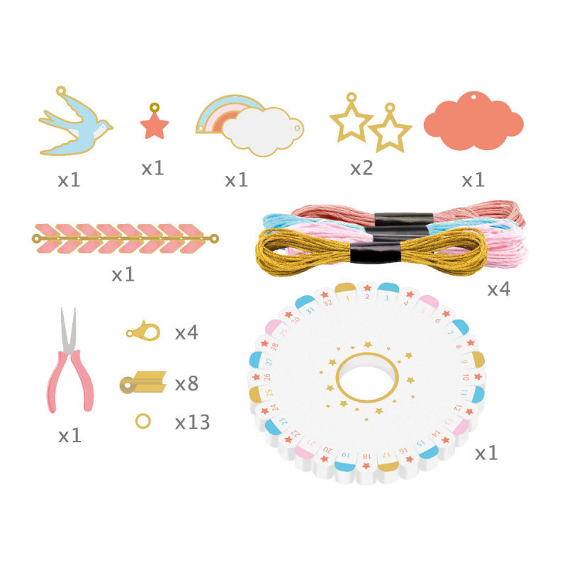 Contenu: 1 outil de tressage en mousse, 4 échevettes de fils, 7 breloques et pendentifs, fermoirs et anneaux, 1 pince et 1 livret explicatif pas à pas en couleurs