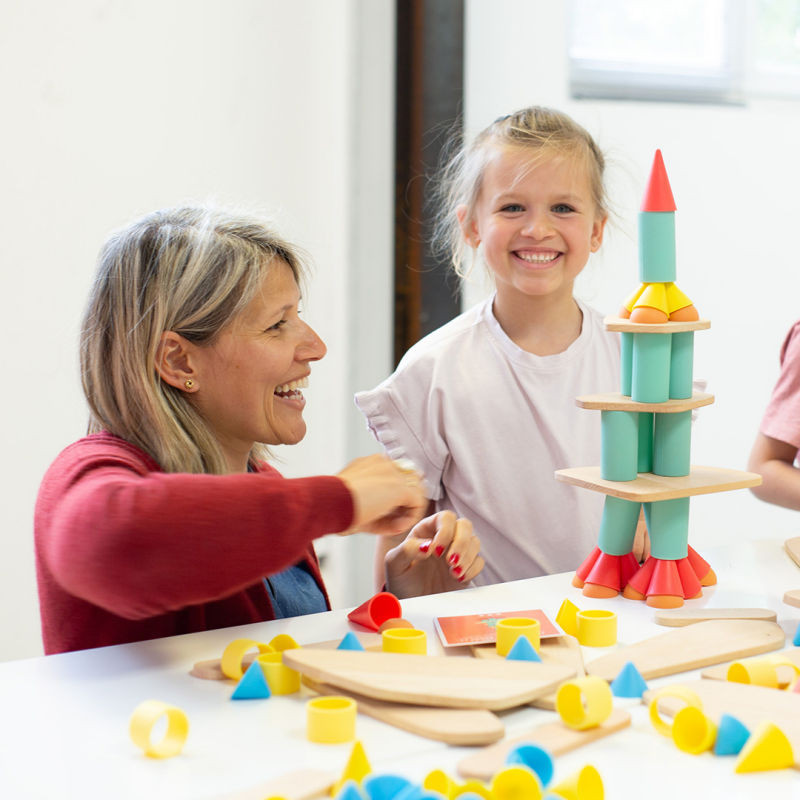 Contenu: 96 pièces: 9 plateaux en bois massif de hêtre (épaisseur: 0.8 cm), 10 planchettes en bois longues (19 x 3.8 x 0.8 cm), 10 planchettes en bois courtes (11 x 3.8 x 0.8 cm), 27 cônes en silicone non-toxique (3 tailles, 3 couleurs), 10 tubes cylindriques longs en silicone (diamètre: 3.5 x 6.8 cm), 10 tubes cylindriques courts en silicone (diamètre: 3.5 x 2.6 cm), 20 demi-sphères en silicone (diamètre: 3.8 x 1.6 cm), 1 sac de rangement en coton naturel, 1 jeu de cartes créatives (24 cartes avec 3 niveaux de difficulté) et 1 livret d'instructions avec des exemples de constructions