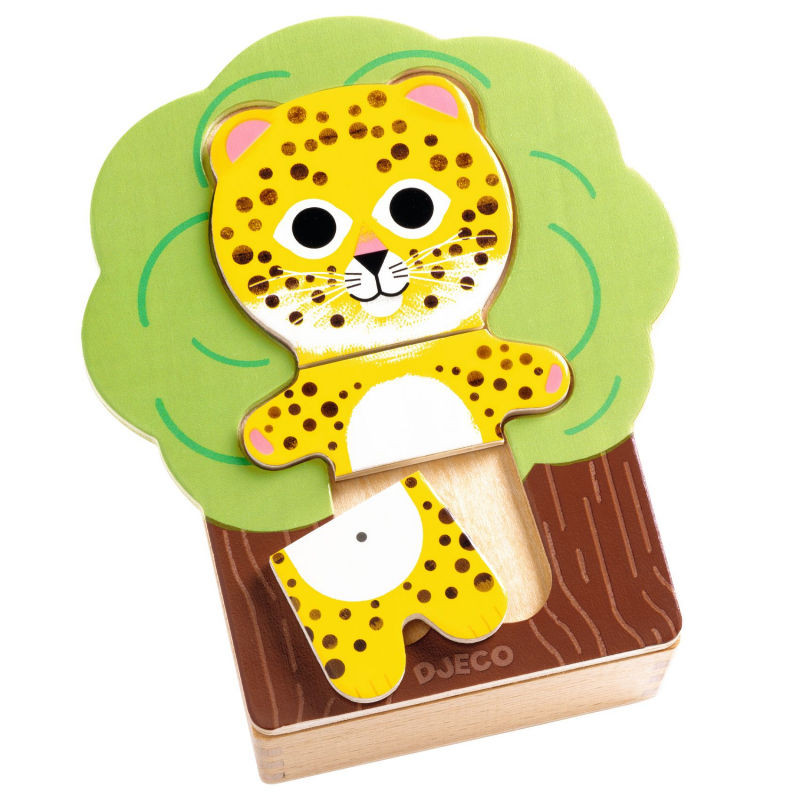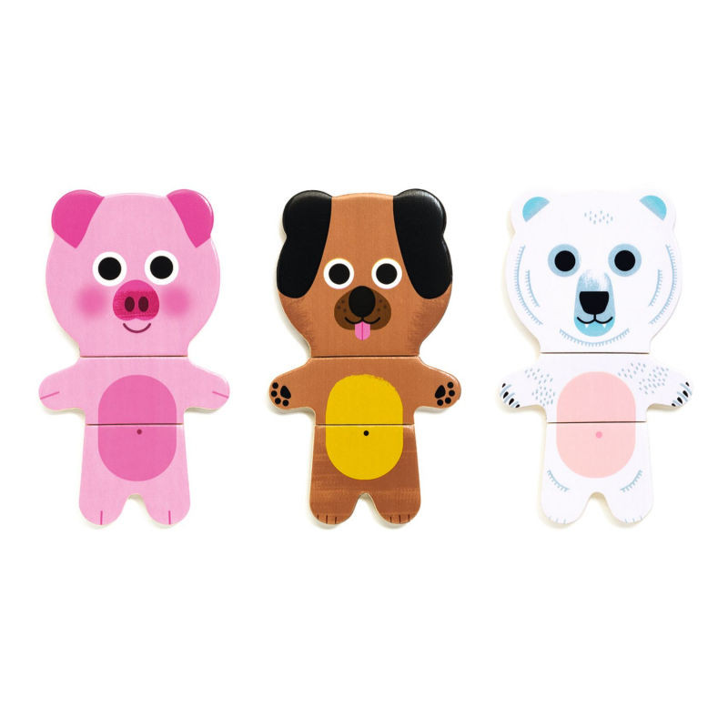 Le puzzle Arbramix contient 6 animaux colorés, chacun composé de 3 pièces en bois. Sur le couvercle de la boîte, l’enfant joue à reconstituer l'animal de son choix: le léopard, la grenouille, le hibou, l'ours polaire, le cochon ou le chien. Il peut aussi s’amuser à mélanger les pièces au gré de son imagination, pour créer toutes sortes d'animaux rigolos...