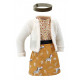 Cette jolie tenue est composée d'une jupe imprimée et d'une blouse à manches courtes. La tenue est complétée par un gilet en tricot beige et un bandeau élastiqué pour cheveux.