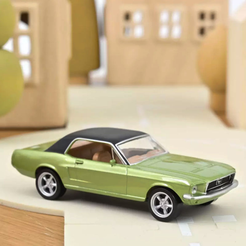 Cette voiture miniature est une reproduction fidèle d'une Ford Mustang de 1968, avec une peinture authentique Lime Green Metallic et un toit noir.